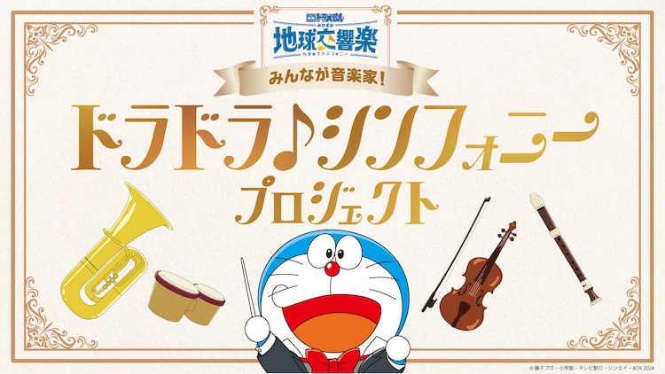2024年3月に公開される「映画ドラえもん のび太の地球交響楽」の冒険のテーマは「音楽」。日常に当たり前のように存在する音楽が、もしも地球からが消えてしまったら……そんなのび太たちの新しい冒険が描かれる。「ドラドラ♪シンフォニープロジェクト」は、子供たちに「みんなで響き合う音楽の楽しさ」を感じてもらい、音楽への挑戦を応援することをコンセプトにしたプロジェクトで、一緒に楽器を練習し、演奏会に挑戦する子供たちを募集する。