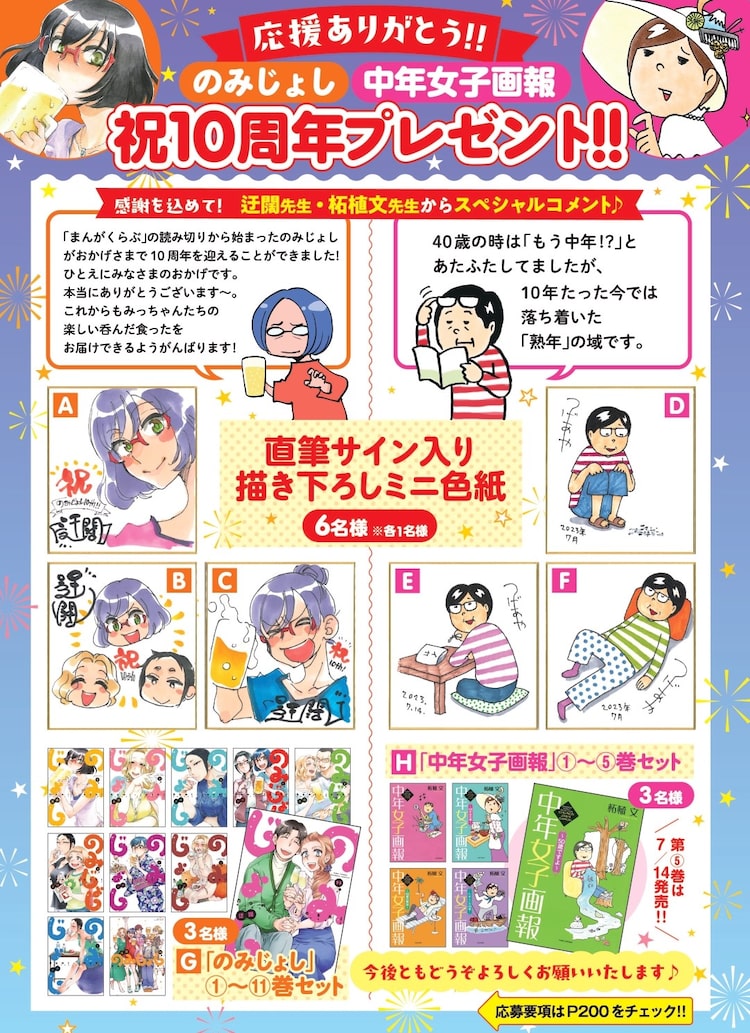 迂闊「のみじょし」と柘植文「中年女子画報」の2作品が10周年を迎えた。これを記念して本日7月11日発売のまんがライフオリジナル8月号(竹書房)では、プレゼント企画が実施されている。