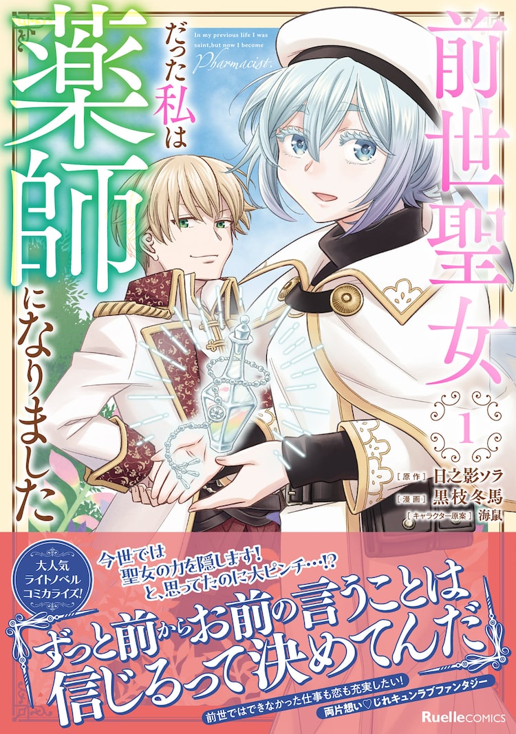 宮廷薬師のアレイシアには誰にも言えない秘密があった。それは前世が、聖なる力によって人々の病を治す聖女だったこと。若くして死んでしまった彼女は、今世ではより多くの人の命を助けたいと、聖女であることを隠しながら万能薬の開発に勤しんでいた。2人の王子や勉強熱心な弟子に囲まれ充実した日々を送っていたが、ある日自分とは別の聖女が現れて……。日之影による小説を黒枝がコミカライズした同作は、COMICリュエルで連載中。購入特典として、応援書店では描き下ろしのモノクロペーパーが配布される。