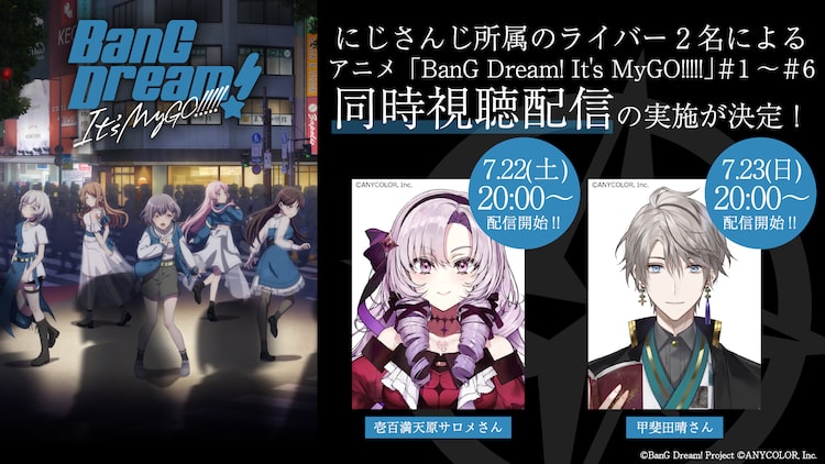 アニメ「BanG Dream! It’s MyGO!!!!!」第1話から第6話までの同時視聴配信が決定。7月22日20時よりにじさんじのYouTuber・壱百満天原サロメ、7月23日20時より同じくにじさんじのYouTuber・甲斐田晴が、それぞれのYouTubeチャンネルで実施する。