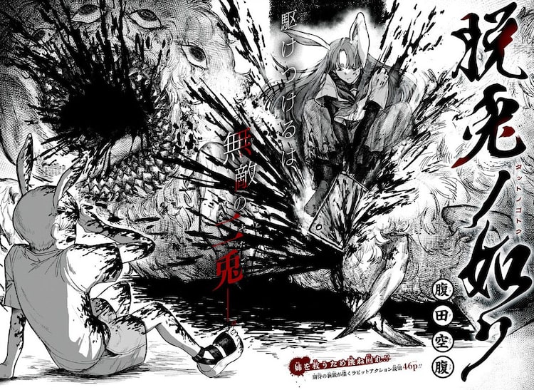 うさぎの3姉妹の絆を描く、“ラビットアクション”「脱兎ノ如ク」がジャンプ+で 2023年7月23日2023年7月23日 editor 「脱兎ノ如ク」扉ページ (c腹田空腹)/集英社腹田空腹による読み切り「脱兎ノ如ク」が、本日7月23日に少年ジャンプ+で公開された。 「脱兎ノ如ク」の舞台となるのは、魑魅魍魎がうごめく世界。ある日、うさぎの3姉妹の長女・ヤヨイが、双子の妹・サツキとウヅキの目の前で、化け物に食べられてしまうところから物語が動き出す。サツキとウヅキは交番に相談しに行くが、その化け物は心臓が200万で取り引きされている強敵で……。強い絆で結ばれた3姉妹の姿が、迫力たっぷりのアクションとともに描かれる。 関連記事舞台「ぼくプリ」第3弾開幕、ゲネプロ写真&コメント到着 大阪公演ライブ配信も決定「シャイニング!」描き下ろしイラストのスケジュール帳など、ちゃおに3冊の手帳「天使のたまご」第3弾入場者プレゼントは復刻チラシ 菅野由弘&若林和弘の舞台挨拶も「カグラバチ」が「ユニオンアリーナ」のカードに 最強ジャンプなど3誌に付属「名探偵コナン」アニメ30周年企画始動、制作過程明かす企画展が東京を皮切りに全国でアーニャたちが雪遊び!TOHO animation「ジャンプフェスタ」出展に向けたイラスト Tweet