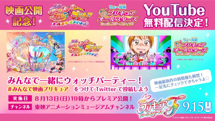 また、配信開始日の8月13日19時からは、ウォッチパーティー企画も開催。ハッシュタグ「#みんなで映画プリキュア」をつけてTwitter(X)に投稿するとプレゼントが当たる。さらにプリキュアシリーズのTikTok公式アカウントでは「映画プリキュアオールスターズ」過去8作品を振り返るショート動画「『映画プリキュアオールスターズ』FILM COLLECTION」が始動。第1弾として、2009年公開の「映画プリキュアオールスターズDX」の映像が投稿された。