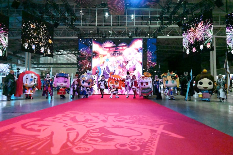 今回のテーマは夏祭り。日本をはじめ、カーニバルやランタン祭など世界の祭をイメージした展示が登場した。入場すると目に飛び込んでくるのは全長34mのウェルカムロード。カーニバルのような衣装をまとった始皇帝やカーマ(アヴェンジャー)のスタンディが並び、来場者を出迎える。絨毯の先には高さ8.4mの大型スクリーンが設置され、描き下ろしイラストを交えて各エリアを紹介する映像が流れた。開場時にはコスプレイヤーと着ぐるみが集合。コスプレイヤーは光のコヤンスカヤとバーヴァン・シーが新たに加わり、着ぐるみもお祭り風の衣装が初お披露目となった。