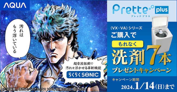 武論尊原作による原哲夫「北斗の拳」のケンシロウが、AQUAの全自動洗濯機「Pretteシリーズ」のキャンペーンキャラクターに就任した。