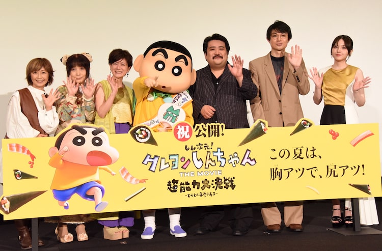 劇場アニメ「しん次元!クレヨンしんちゃんTHE MOVIE 超能力大決戦 ~とべとべ手巻き寿司~」の公開記念舞台挨拶が、本日8月5日に東京・TOHOシネマズ 六本木ヒルズで開催。レギュラーキャスト・小林由美子、ならはしみき、こおろぎさとみ、ゲスト声優・空気階段の鈴木もぐらと水川かたまり、鬼頭明里に加え、野原しんのすけが登壇した。