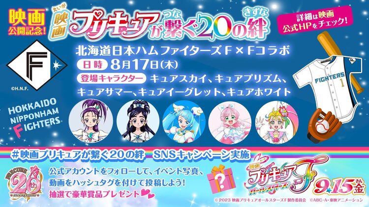 「映画プリキュアオールスターズF(エフ)」と北海道日本ハムファイターズが、“F”つながりでコラボレート。8月17日に北海道・ES CON FIELD HOKKAIDOで行われるプロ野球公式戦「北海道日本ハムファイターズ vs. 千葉ロッテマリーンズ」の5回裏終了後に、プリキュアがファイターズガールとYMCAダンスを披露する。