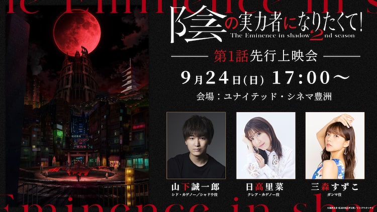 TVアニメ「陰の実力者になりたくて! 2nd season」の第1話先行上映会が、9月24日に東京のユナイテッド・シネマ豊洲で開催される。