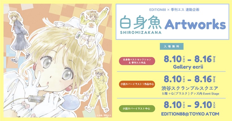 アニメーターの堀口悠紀子が別名義である白身魚として発表したイラストをフューチャーした企画展「白身魚 Artworks」が、本日8月10日より東京・EDITION88@TOKYO ATOM、渋谷スクランブルスクエア、Gallery ecriiの3カ所にて同時開催されている。