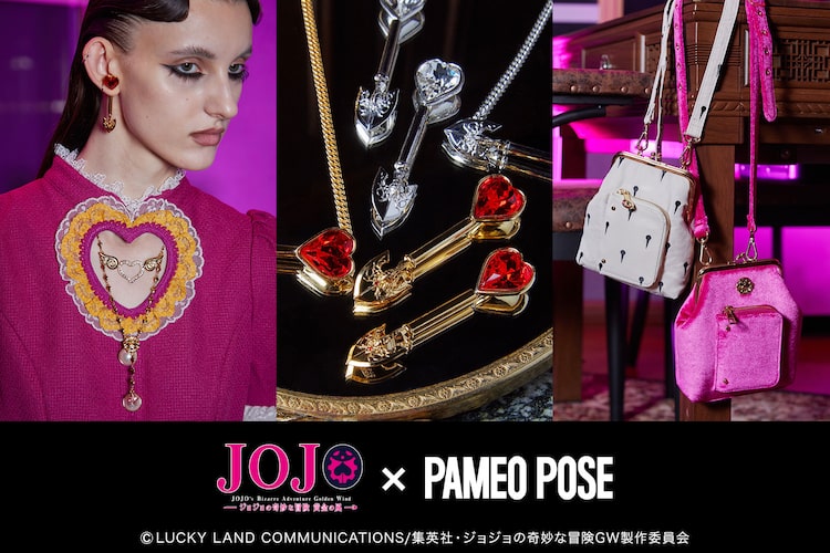 「ジョジョの奇妙な冒険 黄金の風×PAMEO POSE」では、登場キャラクターをイメージしたワンピース、バッグ、チョーカー、ネックレスなど全32種をラインナップ。気品漂うパープルのベロアと、シーリングスタンプ調にしてあしらわれたゴールドのてんとう虫でジョルノ表現したバッグ、スタンドの矢をPAMEO POSE定番のハートクリスタルと組み合わせたピアス、ブチャラティの能力を表現した二連のジップ風チェーンが付いたMA-1、ミスタのスタンド、セックス・ピストルズの弾丸モチーフの指輪などが登場した。