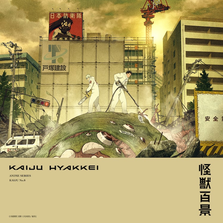 「怪獣百景」は松本が少年ジャンプ+で公開している、本編では描かれない日常のひとコマや怪獣との戦いを描く企画。同企画がアニメでも行われることとなった。最初のビジュアルで描かれたのは、怪獣専門清掃業者“モンスタースイーパー”で働く日比野カフカと市川レノ。日本防衛隊によって討伐されたばかりの巨大な怪獣を解体・清掃する2人の奥には、彼らが憧れる防衛隊の看板が。そこには日本防衛隊第3部隊隊長の亜白ミナも描かれた。
