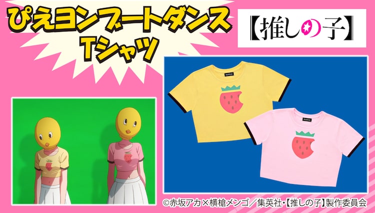 赤坂アカ・横槍メンゴ原作によるTVアニメ「【推しの子】」に登場する人気YouTuber・ぴえヨンと、B小町のルビー、有馬かなが踊っていた“ぴえヨンブートダンス”をイメージしたTシャツが登場。バンダイのキャラクターファッションサイト・バンコレ!で予約を受け付けている。