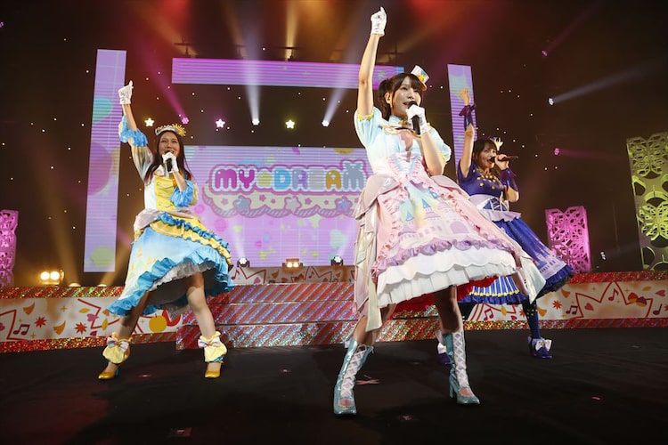 そんな中、おなじみの「Believe My DREAM!」のイントロとともにステージに浮かび上がったのは、見慣れないシルエットの3人。明かりがつき、それが新しい衣装をまとったMY☆DREAMであることがわかると、客席からは大きな歓声が沸いた。朝・昼・夜の“時のコーデ”をまとったMY☆DREAMは、さらに新曲「シリアル・ドリーマー!!!」を初披露。3人の名前がちりばめられた歌詞や、これまでの楽曲のものを盛り込んだ振り付けなど、これまでのMY☆DREAMを総括しながらも、まだまだ成長するという強い意志を感じる楽曲に、観客はこの日一番の大きな拍手を贈った。