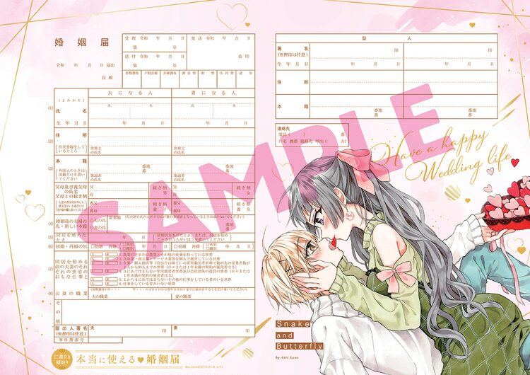 「仁義なき婿取り」実際に使える婚姻届が付録に、アイドルのマネになる新連載も 2023年10月5日2023年10月5日 editor 「本当に使える♡仁義なき婚姻届」佐野愛莉「仁義なき婿取り」の付録「本当に使える♡仁義なき婚姻届」が、本日10月5日発売のSho-Comi21号(小学館)に付属している。 婚姻届は実際に使えるアイテム。愛夏羽と紀羅のラブラブな姿がデザインされている。 また今号では花本麻実の新連載「マネがアイドルに推されて炎上不可避です!?」が開幕。推しではないアイドルグループのマネージャーになった主人公の奮闘を描く。 関連記事「未来のムスコ」に塩野瑛久、小瀧望、兵頭功海が出演 主人公の夫候補“まーくん”役「閃光のハサウェイ キルケーの魔女」マフティーのメンバーに白熊寛嗣、永瀬アンナら初恋の人はほんわか美女の吸血鬼、人外ラブコメ「なごみ吸血鬼のこごみさん」1巻CLAMP作品の新装版シリーズに「CLOVER」が登場、カバーはCLAMPの描き下ろしキスマイ宮田俊哉の小説「境界のメロディ」アニメ化!声優は伊東健人、佐久間大介ら続投「ワンパンマン」白上フブキらホロライブVTuber7人が応援イラスト描く企画が始動 Tweet 関連コミック 仁義なき婿取り マネがアイドルに推されて炎上不可避です!