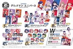 「グリッドマンユニバース第2弾 ハピネスチャンスクジ」では、S賞からD賞まで用意。S賞のB2タペストリー、A賞の3Dアクリルフィギュア、B賞のクリアポスターは宝多六花、南夢芽、飛鳥川ちせ、新条アカネ、ひめの新規描き下ろしイラストを使用した5種で展開される。またミニアクリルスタンドには描き下ろしイラストのほか、ヒロインたちの姿を切り取った場面カットを使用。ガウマとひめの再開、アカネに頭を下げるナイト、蓬と向かい合い赤面する夢芽といった印象的なシーンがピックアップされた。13種で展開されるD賞の缶バッジには裕太、内海、暦ら男性陣もラインナップされている。
