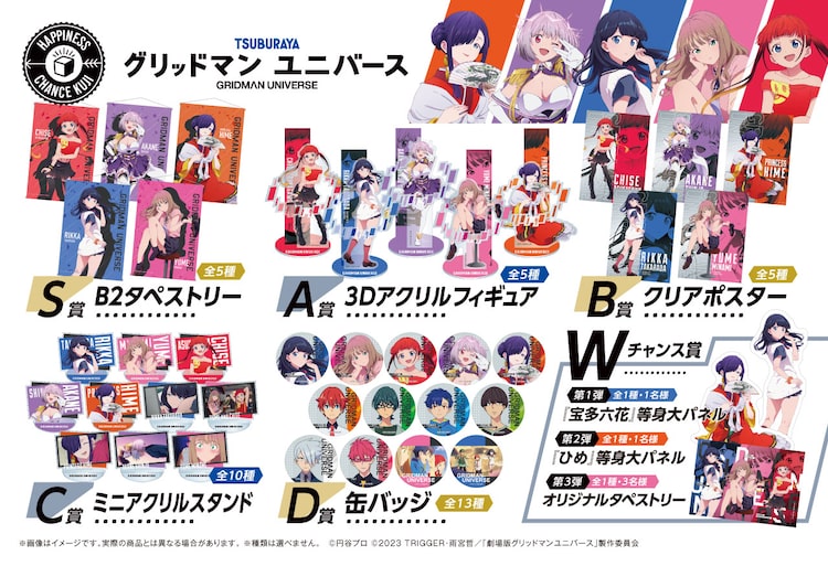 「グリッドマンユニバース第2弾 ハピネスチャンスクジ」では、S賞からD賞まで用意。S賞のB2タペストリー、A賞の3Dアクリルフィギュア、B賞のクリアポスターは宝多六花、南夢芽、飛鳥川ちせ、新条アカネ、ひめの新規描き下ろしイラストを使用した5種で展開される。またミニアクリルスタンドには描き下ろしイラストのほか、ヒロインたちの姿を切り取った場面カットを使用。ガウマとひめの再開、アカネに頭を下げるナイト、蓬と向かい合い赤面する夢芽といった印象的なシーンがピックアップされた。13種で展開されるD賞の缶バッジには裕太、内海、暦ら男性陣もラインナップされている。