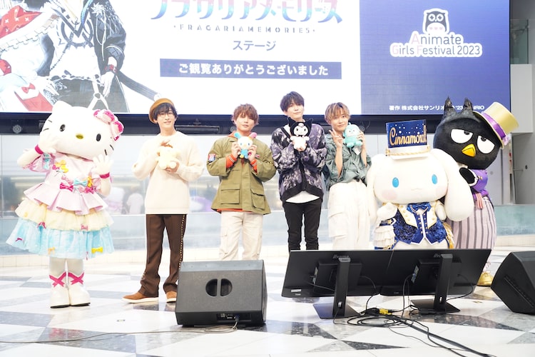 サンリオのメディアミックスプロジェクト「フラガリアメモリーズ」のステージイベントが、本日11月3日に「アニメイトガールズフェスティバル2023」内で開催された。東京・池袋のサンシャインシティ噴水広場で行われたイベントにはプルース役の寺島拓篤、サナー役の仲村宗悟、クロード役の坂田将吾、ハンギョン役の松岡洋平、そしてハローキティ、シナモロール、バッドばつ丸が登壇した。