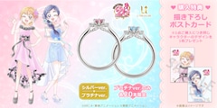 価格はシルバー素材のリングが税込各2万4200円。プラチナ素材のリングは税込各16万5000円で、キュアブラックモデル、キュアホワイトモデルそれぞれ20本限定で用意された。リングを1点購入すると、各モデルに対応したキャラクターのポストカードが1枚付属。ポストカードにはドレスアップした美墨なぎさ/キュアブラックと、雪城ほのか/キュアホワイトが描かれている。