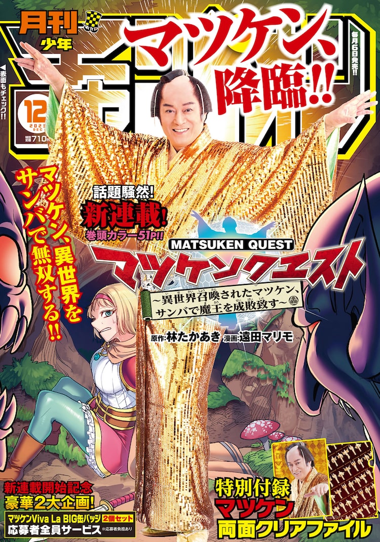 林たかあき原作による遠田マリモの新連載「マツケンクエスト~異世界召喚されたマツケン、サンバで魔王を成敗致す~」が、月刊少年チャンピオン12月号(秋田書店)でスタートした。異世界に飛ばされた松平健を主人公に描かれるファンタジーだ。