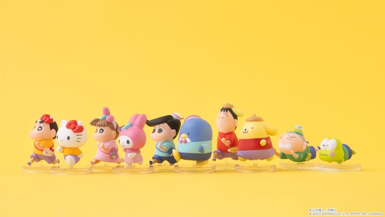 ラインナップは「しんちゃん」「ハローキティ」「ネネちゃん」「マイメロディ」「風間くん」「タキシードサム」「ボーちゃん」「ポムポムプリン」「マサオくん」「けろけろけろっぴ」の全10種。しんちゃんはハローキティといえばのリボンを着けていたり、ハローキティはしんちゃんとお揃いの洋服を着ていたりと、それぞれの特徴を取り入れている。サイズは約2cmから約4.4cm。フィギュアを並べると、みんなで前を向いて走っているようなポージングで立体化されている。