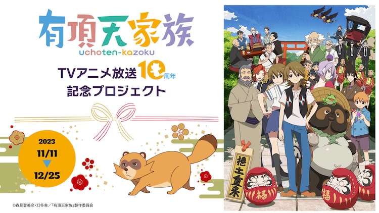 森見登美彦の小説を原作とし、2013年にP.A.WORKSによってアニメ化された「有頂天家族」。物語の舞台となる京都を軸に展開される10周年記念プロジェクトでは、 “有頂天家族愛”を感じられる場を作りたいという思いのもと6つの企画の実施が予定されている。