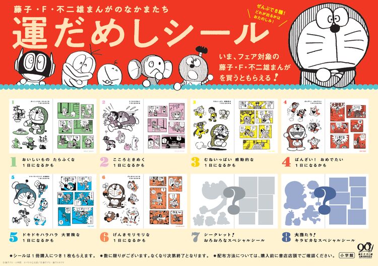 12月1日の藤子・F・不二雄生誕90周年を記念して開催されるこのフェア。対象の書籍を購入すると「ドラえもん」「キテレツ大百科」「パーマン」といったキャラクターの和紙シール「藤子・F・不二雄まんがのなかまたち 運だめしシール」が手に入る。シールは対象書籍1冊につき8種類から1種がランダムで付属。「おいしいもの たらふくな1日になるかも」「こころときめく1日になるかも」などメッセージが記され、おみくじのように楽しめる。また、シークレットの「おろおろなスペシャルシール」と当たりの「キラピカなスペシャルシール」も用意された。対象の書籍は記事末で確認を。