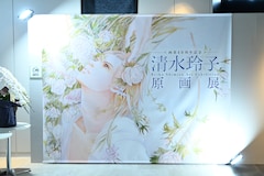 清水にとって初の原画展となる同展では、カラー原画を中心に約200点のイラストやラフなどを展示。会場に入るまでの待機場所にも工夫が凝らされており、清水がこれまでに手がけた作品の年表や、LaLa1993年3月号と4月号(ともに白泉社)の応募者全員サービスとして用意されたタロットカードのパネルなどが飾られ、待機中も清水による美しいイラストを堪能することができる。入り口には原画展のビジュアルが大きく展示され、脇には萩尾望都や日渡早紀らからのお祝い花が飾られていた。