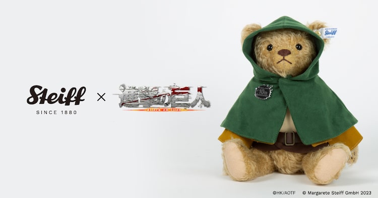 諫山創原作によるアニメ「進撃の巨人」と、ドイツのぬいぐるみブランド・シュタイフによるコラボテディベアが、公式ショップ・リーブス商会で販売。12月5日10時まで先行受注を行っている。