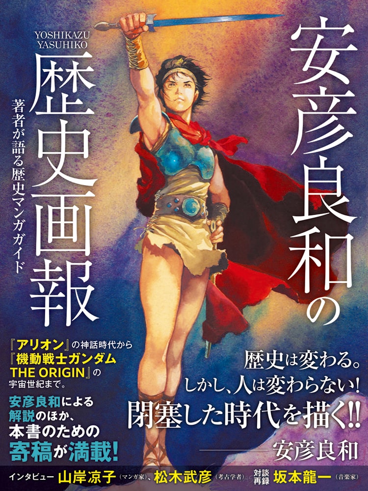 2024年にマンガ家生活45周年を迎える安彦。同書は安彦の歴史マンガからピックアップしたシーンを、オールカラー240ページで紹介する。原稿をオリジナルスキャンし、大型サイズで墨汁の濃淡や筆跡までを再現。原画と合わせて、安彦自ら作品について語るコメントや、編集部による歴史解説コラムを掲載し、鑑賞の手引きとしている。「虹色のトロツキー」の連載秘話を描いた「満洲建国大学の青春」も初めて単行本に収録される。加えて「アラベスク」「日出処の天子」の山岸凉子、考古学者・松木武彦へのインタビューや、安彦と坂本龍一の対談の抄録も収められた。