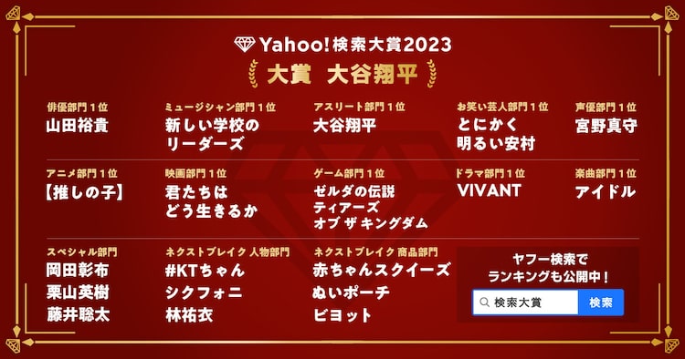 「Yahoo!検索大賞2023」の結果が発表され、アニメ部門1位に「【推しの子】」、映画部門1位に「君たちはどう生きるか」、声優部門1位に宮野真守が選ばれた。