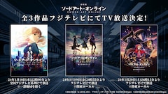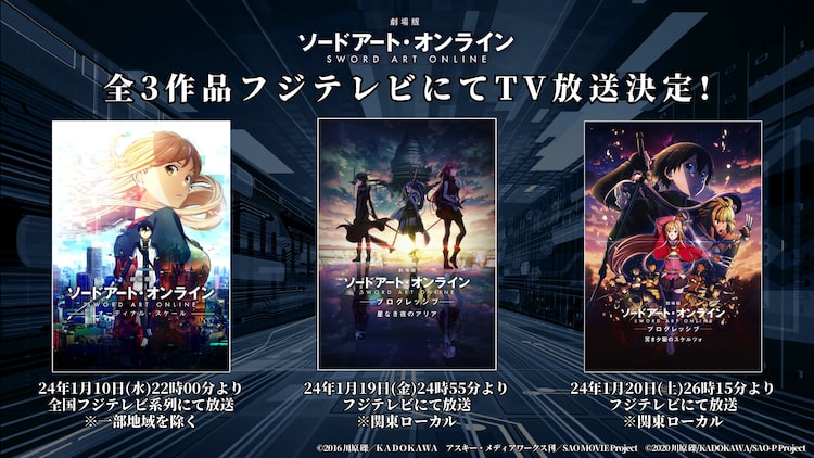 「劇場版 ソードアート・オンライン -オーディナル・スケール-」「劇場版 ソードアート・オンライン -プログレッシブ- 星なき夜のアリア」「劇場版 ソードアート・オンライン -プログレッシブ- 冥き夕闇のスケルツォ」の3作品が、2024年1月にフジテレビにて放送決定。「プログレッシブ」の2作品は今回が地上波初放送となる。