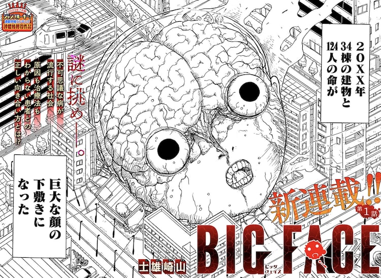 「BIG FACE」の舞台は、頭部が膨張し続けるという、原因も治療法もわからない不可思議な病が流行した世界。建物を倒壊させたり人を下敷きにしたりと周囲へ甚大な被害が出ることから、患者は殺処分とされていた。そんな中で病の対処をする特殊人災処理班に属する、「患者を救出すべき」「患者を処分すべき」という正反対の考えを持つ2人が描写される。なお「BIG FACE」はジャンプルーキー!の連載争奪ランキングで読者に選ばれ、連載化が決定したインディーズ連載作品。今後、隔週水曜日に更新される。
