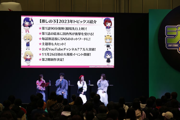 赤坂アカ・横槍メンゴ原作によるTVアニメ「【推しの子】」のステージイベントが、本日12月17日に千葉・幕張メッセで開催された「ジャンプフェスタ2024」内で行われ、アイ役の高橋李依、アクア役の大塚剛央、有馬かな役の潘めぐみ、黒川あかね役の石見舞菜香が登壇した。