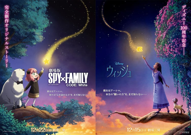 現在公開中の「ウィッシュ」はディズニー創立100周年を記念して制作されたミュージカル映画。願い星に選ばれた少女・アーシャが、どんな願いも叶う魔法の王国・ロサスの真実を知ってしまい、人々のために立ち上がるさまが描かれる。ビジュアルには「SPY×FAMILY」のアーニャが“ステラ”に、アーシャが願い星に手を伸ばす姿が。映像では「劇場版 SPY×FAMILY CODE: White」と「ウィッシュ」のさまざまなシーンが切り取られ、アーシャの日本語版声優を務めた生田絵梨花と、アーニャ役の種崎敦美がナレーションを担当している。
