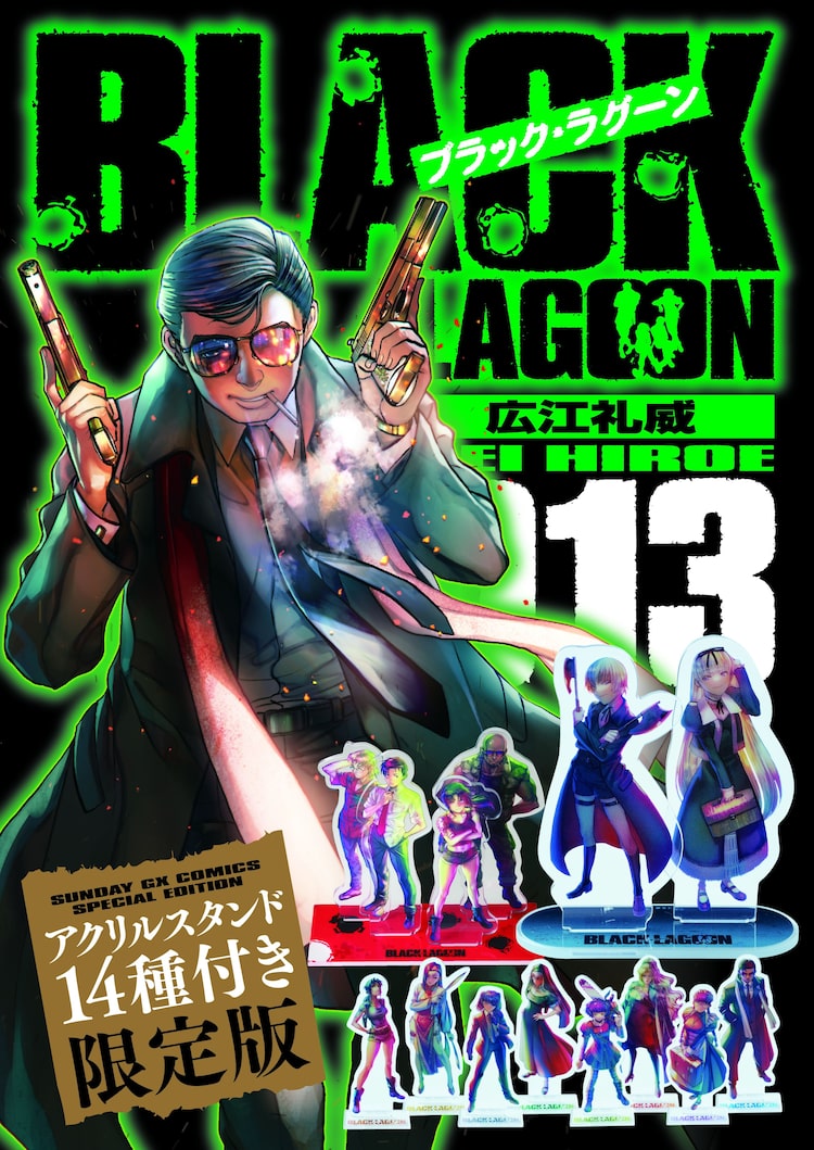 「BLACK LAGOON」13巻は通常版に加え、アクリルスタンド14種付きの限定版も用意。限定版に付属するアクリルスタンドは、月刊サンデーGX(小学館)の付録となったアクリルスタンド12種の新カラーバージョンに、広江の描き下ろしイラストを使用した「ヘンゼル&グレーテル」の2種を加えたものとなる。