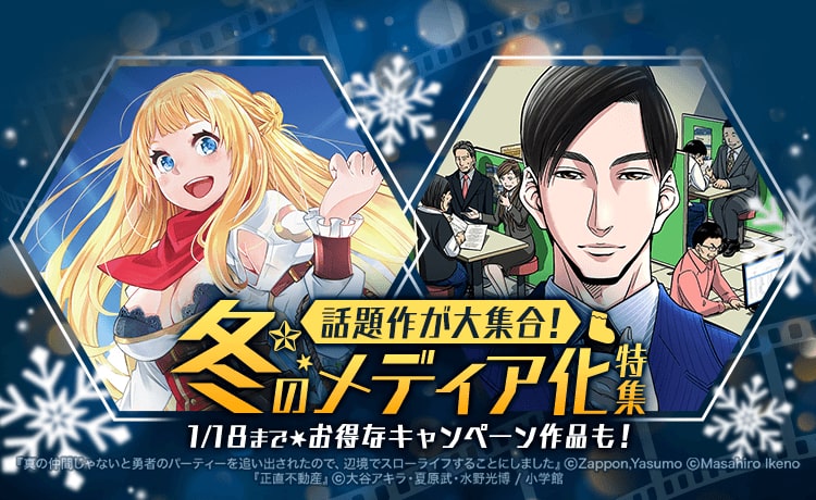 「真の仲間」「正直不動産」…LINEマンガで冬のメディア化作品がお得に読める 2024年1月8日2024年1月8日 editor 「冬のメディア化特集」バナー「冬のメディア化特集」が、LINEマンガで1月18日まで開催されている。 特集では期間中、この冬にメディア化された作品を対象とした無料話の増量や「毎日¥0」のチャージ時間短縮などが行われ、利用者はよりお得にマンガを読むことができる。対象作品は「真の仲間じゃないと勇者のパーティーを追い出されたので、辺境でスローライフすることにしました」「正直不動産」「異世界でもふもふなでなでするためにがんばってます。」「ゆびさきと恋々」など多数。詳細はLINEマンガを確認しよう。 関連記事KADOKAWAタテスクコミック×LINEマンガWEBTOON STUDIOが協業、新連載6本始動「生誕90周年記念 赤塚不二夫祭」音楽フェスにRIP SLYME、氣志團、小泉今日子ら「ワタル」シリーズのイベント第2弾、来年2月に開催、ワタル2に焦点当てたコーナーも魔王の血を引く少年を復讐に利用しようとしたら…LINEマンガ新連載「かげきしょうじょ!!」LINEマンガで本日限定全話無料、最新刊は明日発売LINEマンガ「赤い瞳の廃皇子」が単行本化、未亡人と廃皇子のロマンスファンタジー Tweet