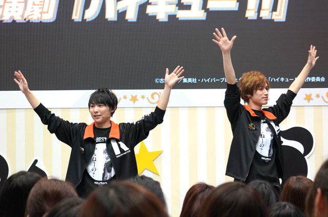 その後観客に向け、須賀と影山が劇中で踊ったダンスの振り付けをレクチャーすることに。大勢の観覧者が詰めかけたブースで2人は、烏野、梟谷、音駒の3校が戦う様子をイメージした「三つ巴ダンス」を披露し、観客とともにダンスを楽しんだ。