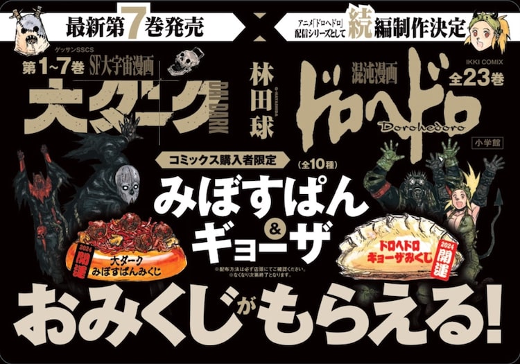 林田球「大ダーク」7巻が、本日1月12日に発売された。去る1月9日には林田の前作を原作としたアニメ「ドロヘドロ」の続編が、配信シリーズとして制作されることが発表されたばかり。「大ダーク」7巻発売とアニメ「ドロヘドロ」の続編制作を記念し、全国の一部書店では2024年の運勢を占える「みぼすぱん&ギョーザおみくじ」がもらえるフェアが開催されている。