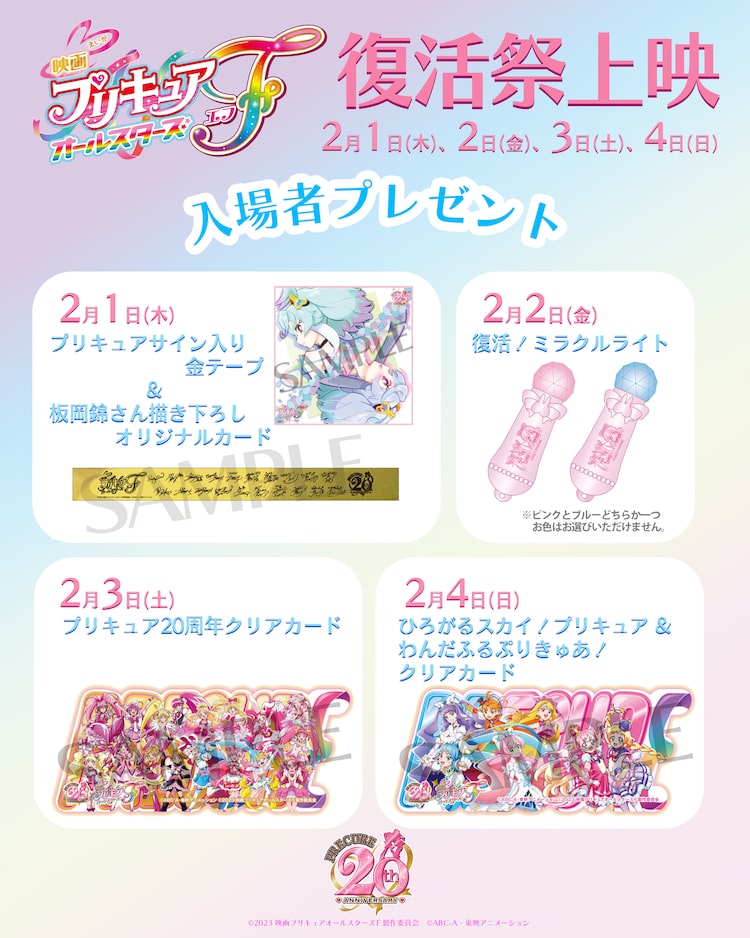 2月1日から4日までの4日間限定で行われる「映画プリキュアオールスターズF」の“復活祭上映”。2月1日の「プリキュアの日!バースデー上映」は、東京・丸の内TOEI1を本会場にスタッフ・キャストが「プリキュア」20周年を振り返るトーク、関連映像のダイジェスト上映などが行われる。続く2月2日の「復活!Fナイト応援上映」では、歓声・応援を解禁した応援上映が実施される。実施劇場は後日発表。