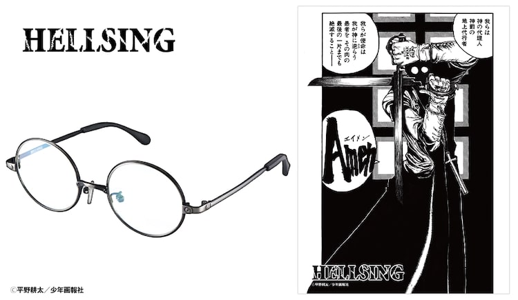「アレクサンド・アンデルセン モデル」には、職人がひとつひとつアンティークダメージ加工を施した、ダークシルバーのメタルフレームを採用。先セルには、フェイクウッド加工も施されており、シンプルなデザインで、男女ともに使用しやすい仕上がりとなっている。また眼鏡本体に加え、「HELLSING」の文字が入った眼鏡ケース、作中のコマを使用した眼鏡拭きが付属する。なおオンラインショップ・店頭では受注販売を2月12日23時59分まで受付中。購入者には7月頃に商品が届けられる。