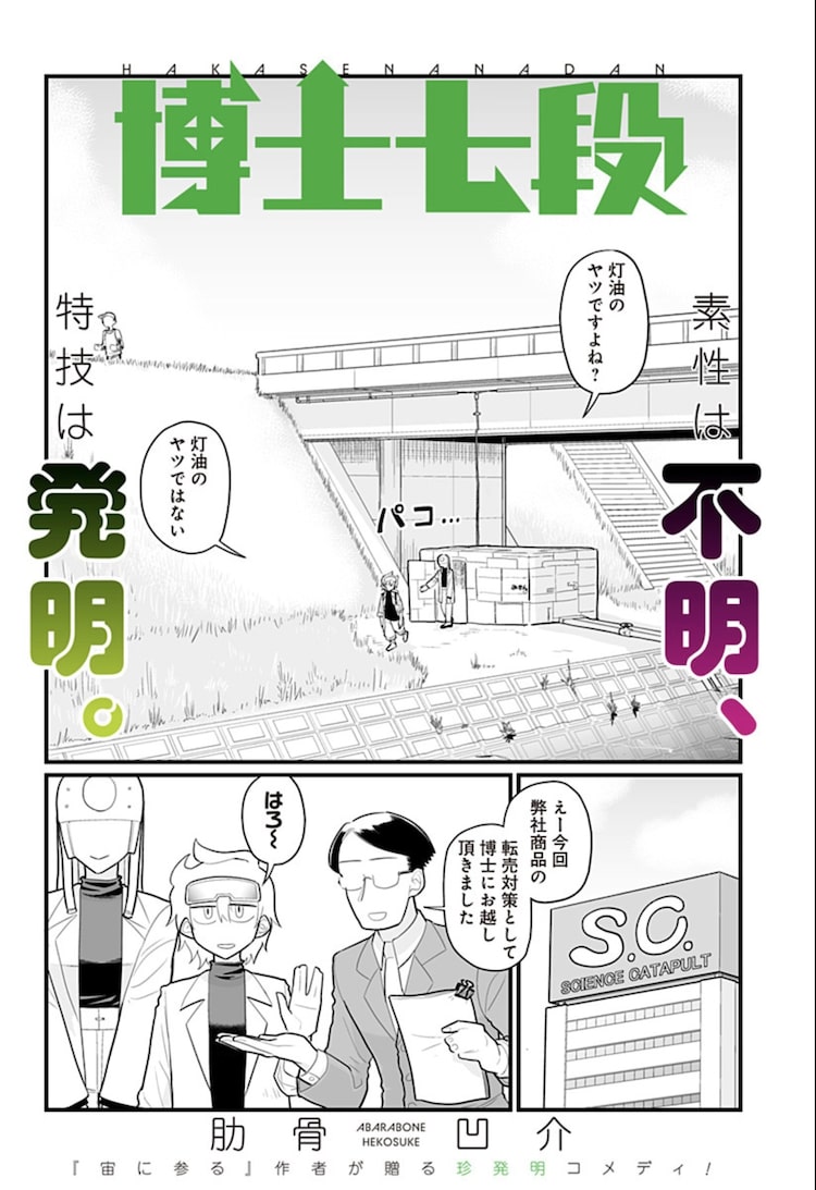 トンチキ発明ばかりの博士が織りなすオムニバスコメディ、ジャンプ+で公開 2024年1月27日2024年1月27日 editor 「博士七段」扉ページ (c)肋骨凹介/集英社肋骨凹介による読み切り「博士七段」が、本日1月27日に少年ジャンプ+で公開された。 同作は河川敷の段ボールハウスに住み、日々トンチキな発明を続ける博士を軸に描くオムニバスコメディ。あるときは短所を汲み取ることができる灯油ポンプのような装置を、またあるときは魚を誘き寄せるために釣り針に興奮するようになる薬を博士は生み出す。 関連記事「神の雫」TVアニメ化、2026年に放送・配信 神咲雫役は亀梨和也、制作はサテライト青山剛昌、房総半島の特殊な隧道の謎に挑む「道との遭遇」でバラエティ番組ロケ初出演ドラマ「ちるらん」土方に立ちはだかる“芹沢派”に奥野瑛太、高橋光臣、金子ノブアキら「神呪のネクタール」呪乳100選ポスターがRED付録に ロボットバトル新連載も「天使なんかじゃない」リップやアイシャドウなどメイクアイテム登場、羽チャーム付き傷心青年×不良僧侶、この出会いが人生を変える「あかつきに漣」1巻 Tweet