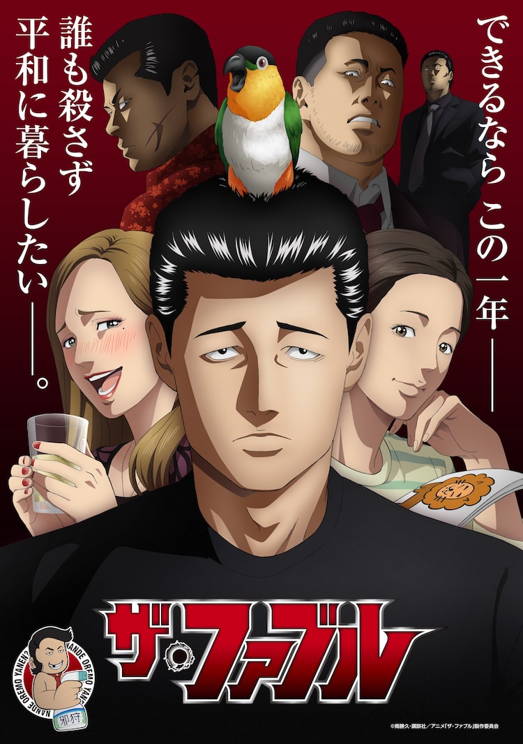 4月より2クールにて放送される「ザ・ファブル」。メインビジュアルには頭にインコを乗せた佐藤明を中心に、笑顔でグラスを抱える佐藤洋子、明のライオンのイラストを手にした清水岬らが描かれた。その背後には、海老原、小島、ボスの姿も収められている。