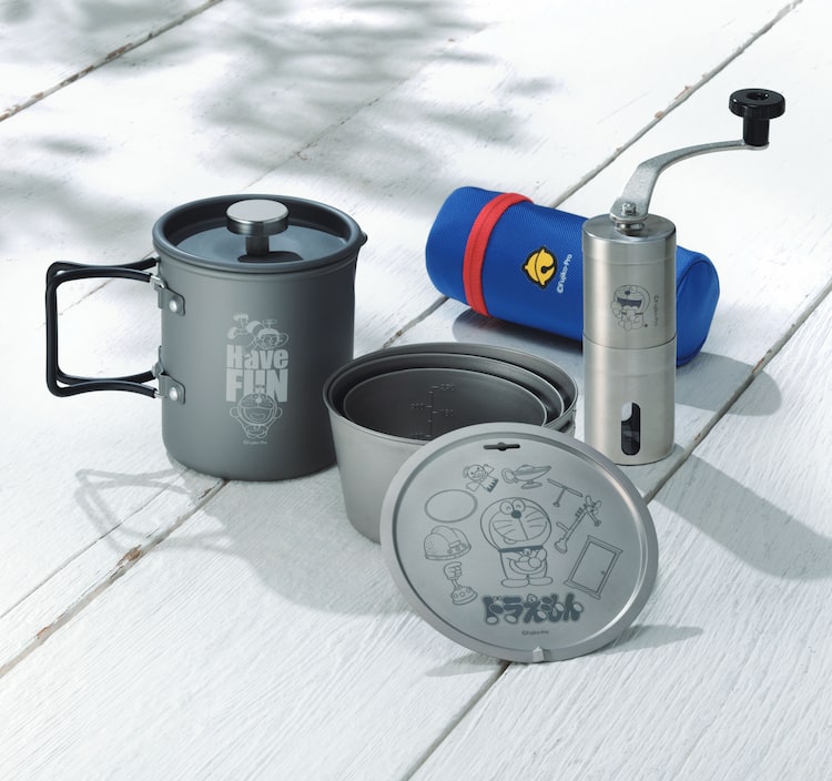 今回発売されるグッズはアウトドア専門誌・BE-PAL(小学館)が企画。アウトドアブランド・ハイマウントとのコラボ商品には、コーヒーに関連するアイテムが用意された。コーヒーメーカーは簡単に美味しいコーヒーが淹れられるフレンチプレス式。本体にはタケコプターで空を舞うドラえもんとのび太のイラストがあしらわれた。コーヒーミルは、ドラえもんをイメージした専用ケースとセットで販売される。