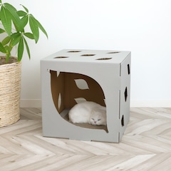 組み立て式となる「獄門疆ペットハウス」の完成サイズは、幅・奥行き・高さ36cm。猫が中に入ったり、穴から手を入れたり覗いたりして楽しく遊ぶことができる。底面にはダンボール製の爪とぎが付属。猫が高い所から飛び乗ったりしてしまうと、潰れる可能性があるためご注意を。