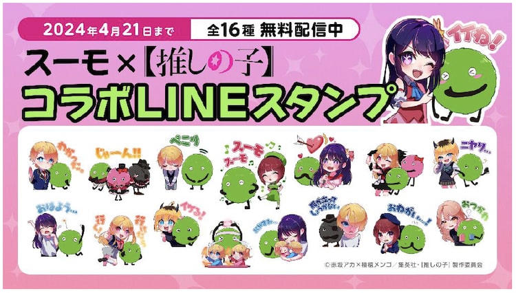 赤坂アカ・横槍メンゴ原作によるTVアニメ「【推しの子】」とSUUMOがコラボしたLINEスタンプが、4月21日までの期間限定で無料配信されている。