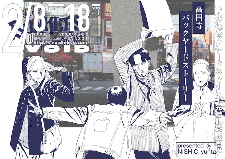 月刊コミックビーム(KADOKAWA)で連載され、1月に最終3巻が発売された「下北沢バックヤードストーリー」。その連載で使用された原稿を個展「高円寺バックヤードストーリー」では展示、販売する。加えて描き下ろしのペインティング作品、ドローイング作品、各種関連グッズなども扱う。