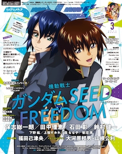 キラ・ヤマトとアスラン・ザラの描き下ろしイラストが表紙を飾るアニメディア3月号。表紙イラストはピンナップとしても付属する。巻頭特集で展開する記事では、キラ役の保志総一朗、ラクス・クライン役の田中理恵、アスラン役の石田彰、シン・アスカ役の鈴村健一、オルフェ・ラム・タオ役の下野紘、イングリット・トラドール役の上坂すみれ、カガリ・ユラ・アスハ役の森なな子、ディアッカ・エルスマン役の笹沼晃のインタビューを掲載。さらに監督を務めた福田己津央と、メカニカルデザイン担当の大河原邦男と山根公利のインタビューでは、20年の時を超え劇場版として帰ってきた劇場アニメの制作秘話が語られる。