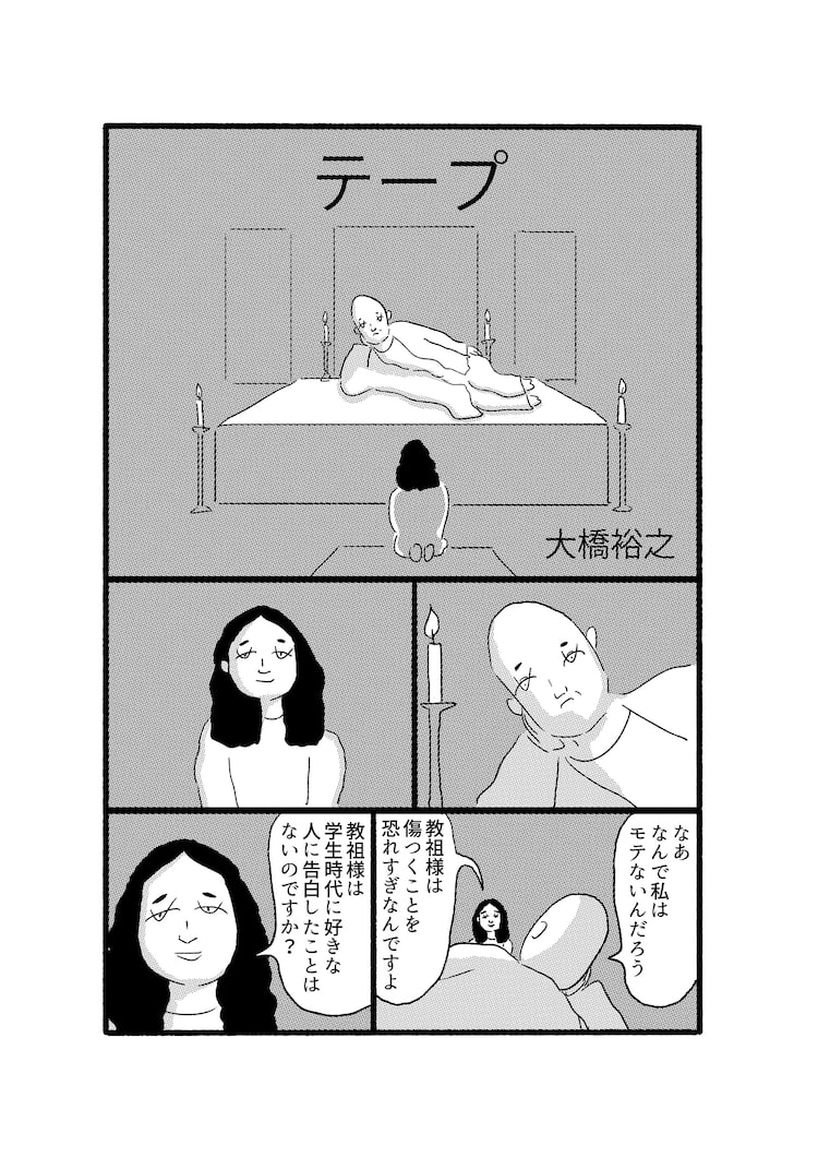 大橋が描き下ろしたサイドストーリーのタイトルは「テープ」。ロウソクに囲まれた祭壇のようなところで頬杖をついて寝転がる、みなみかわ演じる新興宗教教祖の富岡以蔵と、それに正座で向かい合う、かが屋・賀屋壮也が演じる熱心な信者の男のやり取りが描かれた。続きのページはDMM TVの公式X(旧Twitter)で公開中だ。