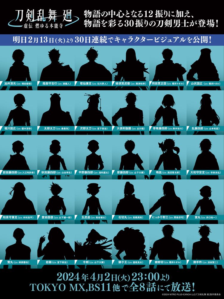 4月2日23時よりTOKYO MX、BS11ほかで放送開始される「刀剣乱舞 廻 -虚伝 燃ゆる本能寺-」。すでに発表されている物語の中心となる12振りに加え、加州清光、陸奥守吉行、歌仙兼定、蜂須賀虎徹ら30振りが作中に登場する。