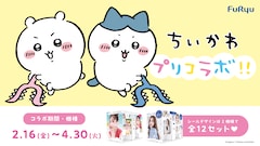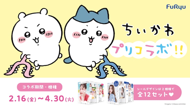 ナガノ「ちいかわ」とプリントシール機が初のコラボレート。ちいかわの絵柄の撮影フレーム・シールふちセットが、「MY PALETTE」と「キューナナパーセント2」に2月16日から4月30日までの期間限定で登場する。