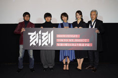 アニメ「刻刻」先行上映会の様子。左から大橋誉志光監督、ぼくのりりっくのぼうよみ、佑河樹里役の安済知佳、間島翔子役の瀬戸麻沙美、じいさん役の山路和弘。